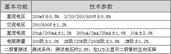 机身采用先进的两次注塑工艺,耐冲击,确保仪表壳有更可靠的绝缘性能; 符合国际安全标准,最大允许瞬间电压为4000V,最大显示值为1999(3 1/2位),自动极性显示