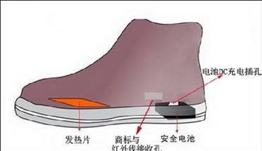 使用特制的航空级电池供热技术,解决了千百年无法解决的脚部御寒保暖难题,适用于在-30℃以内的环境里,通过鞋底发热,使其发热体控温在50℃-65℃之间,再通过脚部穴位源源不断地将热量输送到人体各个部位,解决寒从脚起的根源,从而满足于各种御寒需要,实现了脚热全身暖的功效。