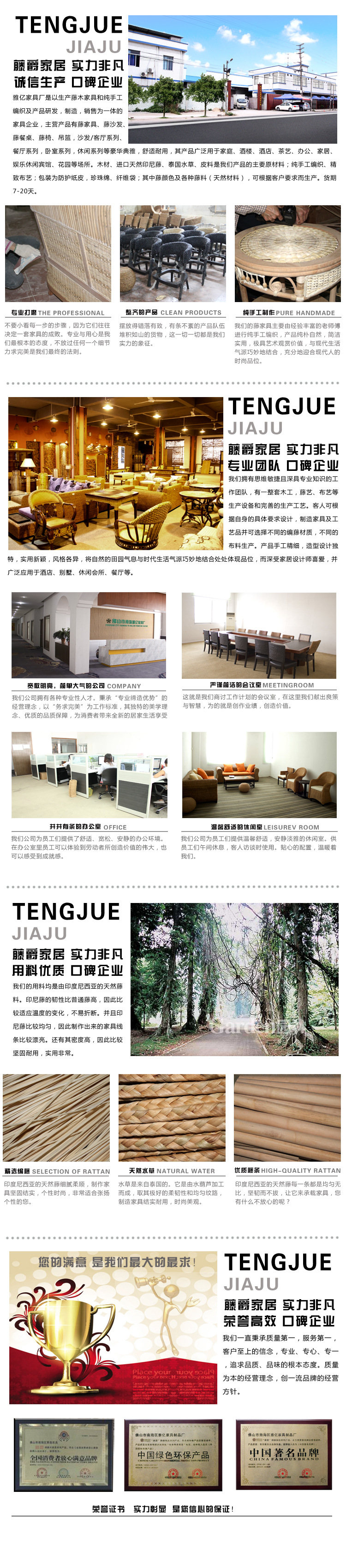 我们拥有思维敏捷且深具专业知识的工作团队,拥有一整套木工、藤艺、布艺等等生产设备和完善的生产工艺,所有产品一条龙完成。在产品开发上有着匠心独到设计和执着的追求,力求新颖,独特,实用,编织出工艺独特的藤家具。客人可以选择不同的编藤材质,不同的布料生产。产品手工精细,处处体现品味,而深受家居设计师喜爱,并广泛应用于酒店、别墅、休闲会所、餐厅、工程单等。