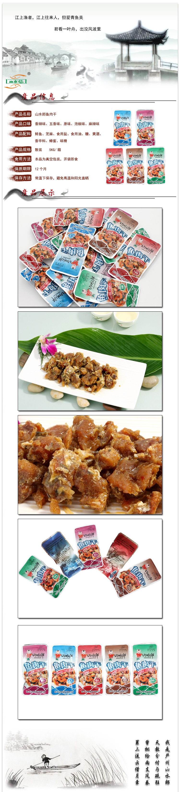浙江山水郎食品有限公司是一家集养殖、加工、销售、科研于一体的杭州市农业龙头企业、科技示范企业,公司成立于2005年,注册资金1000万元。公司拥有1.3万平米现代化标准厂房、二条全自动生产线、1200平米研发中心及研发检测设备。公司通过了QS、ISO9000、HACCP、及食品安全信用体系等相关认证。拥有和申报国家专利31项,其中:《典型生鲜食品的高品质干燥关键技术研究及应用》荣获全国商业科技特等奖。“山水郎”牌风味鱼干,荣获杭州市名牌产品称号。