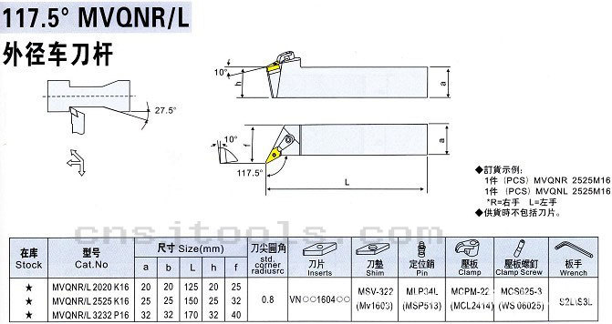 本厂大量供应117.5°复合式外圆车刀MVQNR/L,可转位精密车刀批发