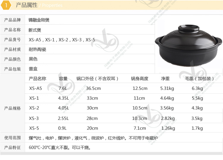 本产品通过ISO9001国际质量管理体系认证,拥有同类产品无法媲美的卓越品质。产品款式丰富,有汤煲、南瓜煲、韩式煲、浅煲、药罐、保健水壶、鸳鸯锅、烤盘等,满足了蒸、煮、煲、炖等多种不同的烹饪要求,而且容量规格一应俱全,为厨房增添了更多色彩.烹饪出来的佳肴原汁原味,沁人心脾、舒心爽口,色泽与口感与众不同.由于该产品有着金属锅、传统砂锅、一般陶瓷制品无法比拟的优点,必将代替金属锅、传统砂锅而成为现代厨室的主流炊具,是家庭、酒店及馈赠好友的最佳选择.