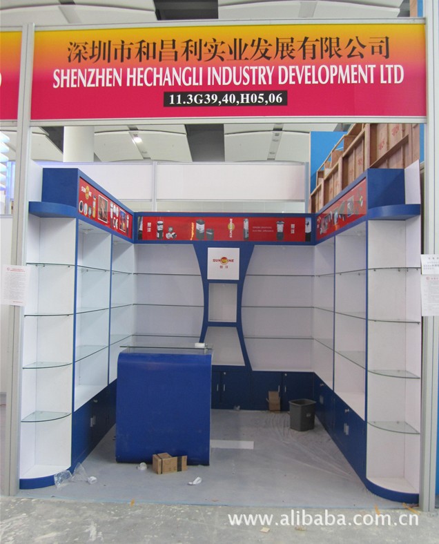 (2) 展架展具租赁:各种接待前台,桌椅,条桌,槽板,射灯,精品柜,精品架,各层次的玻璃柜,玻璃及木制层板,百变货架,超市货架,铁制衣架,各级踏步(梯形台)资料架电视机,电脑,饮水机,冰箱,名片盒,沙发茶几,花草树木及地毯,各种展位装饰材料
