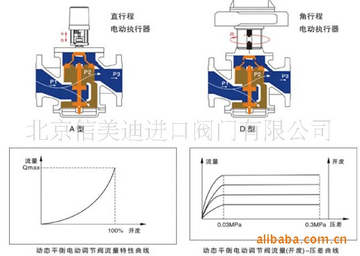 ⑴、当进口压力P1升高时,(P1-P2)增大,这时电动阀阀芯向上运动,使P1、P2间开度减少,阀芯压力P2降低;当进口压力P1降低时,(P1-P2)减小,这时电动阀阀芯向下运动,使P1、P2间开度增大,阀芯压力P2升高。因此,无论系统的压力怎样变化,通过电动阀阀芯的调节作用,P2、P3间的压差始终保持不变。因此这种动阀的抗干扰能力强,具有动态平衡的功能;