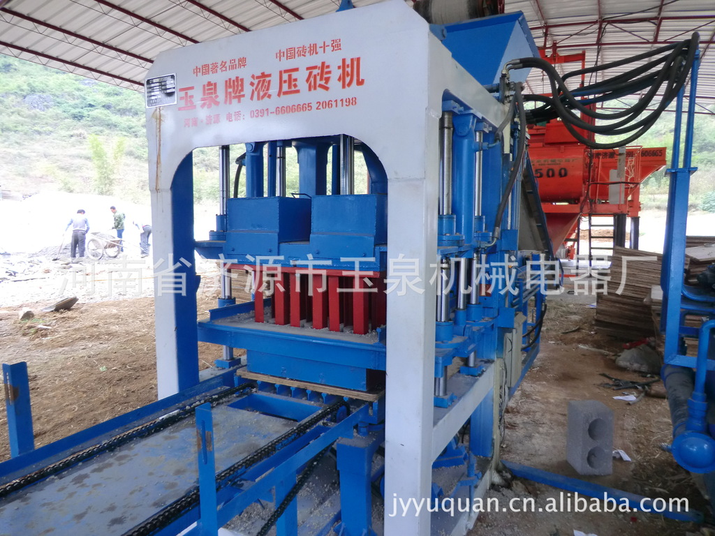 河南省济源市玉泉机械电器厂生产的全自动电脑控制液压砌块砖机,型号有3型机20块∕次,班产量3万块左右。5型机26块∕次,班产量4万块左右。6A型30块∕次,班产量5万块左右。6C型36块∕次,班产量6万块左右。8型机42块,班产量8万块左右。10型机51块,班产量10万块左右。配套产品有电子配料、输送机、搅拌机、锅炉、蒸压釜等设备。