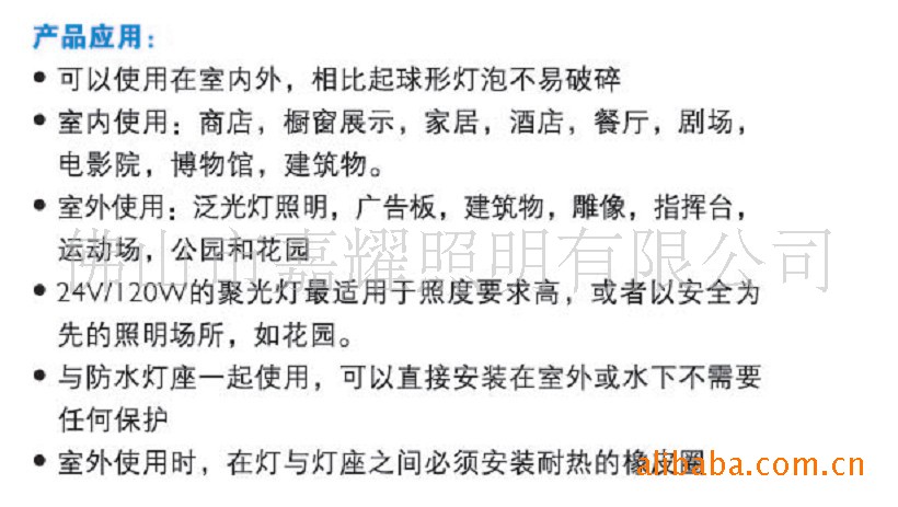 应用:适用于商场、商店的橱窗、柜台、广告招牌、水池照明、舞厅等各种高级投光照明
