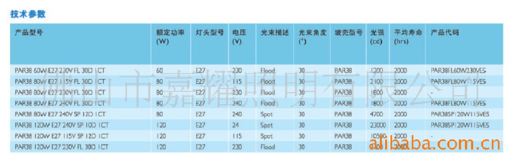 PAR38spot80w | 230 | 80 | 12 | 5400 | E27 | 2000 | 121 | 136 | 15 | 进口 |