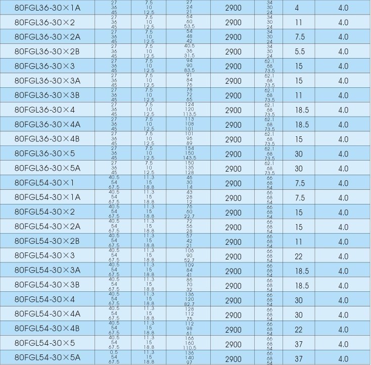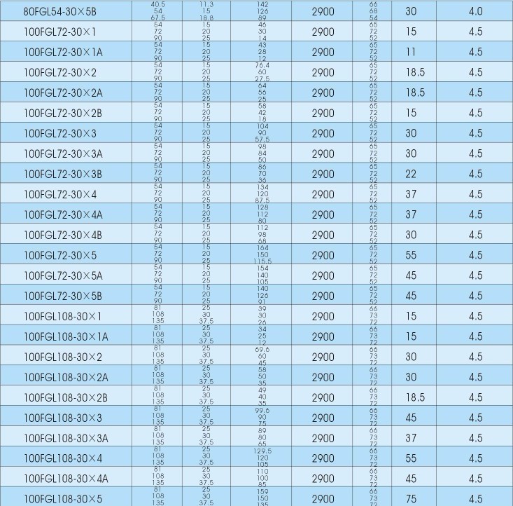 产品简介: FGL(F)系列泵是广州市羊城水泵实业有限公司根据市场需要,在GDL、DL系列立式多级离心泵的基础上、结合国外先进技术、优化设计制造的新一代立式多级稳压泵。该系列泵最大优点是:节能环保,占地面积小,安装方便,可以安装于任一段水平管路中间。 该系列泵采用泵与电机能过夹壳联轴器联接的设计,结构紧凑,运转平稳;全部使用机械密封,无泄漏,使用寿命长;选用优秀水力模型,水力效率高、性能范围广。完全能满足高层建筑,工矿企业的给排水,消防设施及工艺流程需要。适用于输送清水和物理化学性质类似于水的液体。 FGL多级离心泵水段具有良好的吸入性能,叶轮运转平稳,安全可靠,导叶性能优秀,效率高,刚性轴,节能省电,轴承耐磨损,拆装简便,机械密封,正常使用可超过8000小时,外筒为优质不锈钢,耐高压,联接架牢固,电机(Y2,YB)防护等级高,安全,运行平稳,寿命长。 适应场所: 用于高层建筑及住宅群供水,消防喷淋系统供水,冷却循环,锅炉给水及冷凝系统给水等。 型号: 25FGL2-15*(2到10)25FGL4-15*(2到10)40FGL6-18*(2到9) 50FGL12-30*(1到6) 50FGL18-30*(1到5)65FGL24-30*(1到5)80FGL36-30*(1到5)80FGL54-30*(1到5)100FGL72-30*(1到5)100FGL108-30*(1到5)150FGL150-30*(1到5) | 产品名称 | 型号 | 电机功率 | 流量 | 扬程 | 级数 | | FGL立式多级离心泵 | 100FGL72-30×3 | 30 | 72m3/h | 90m | 3级 |