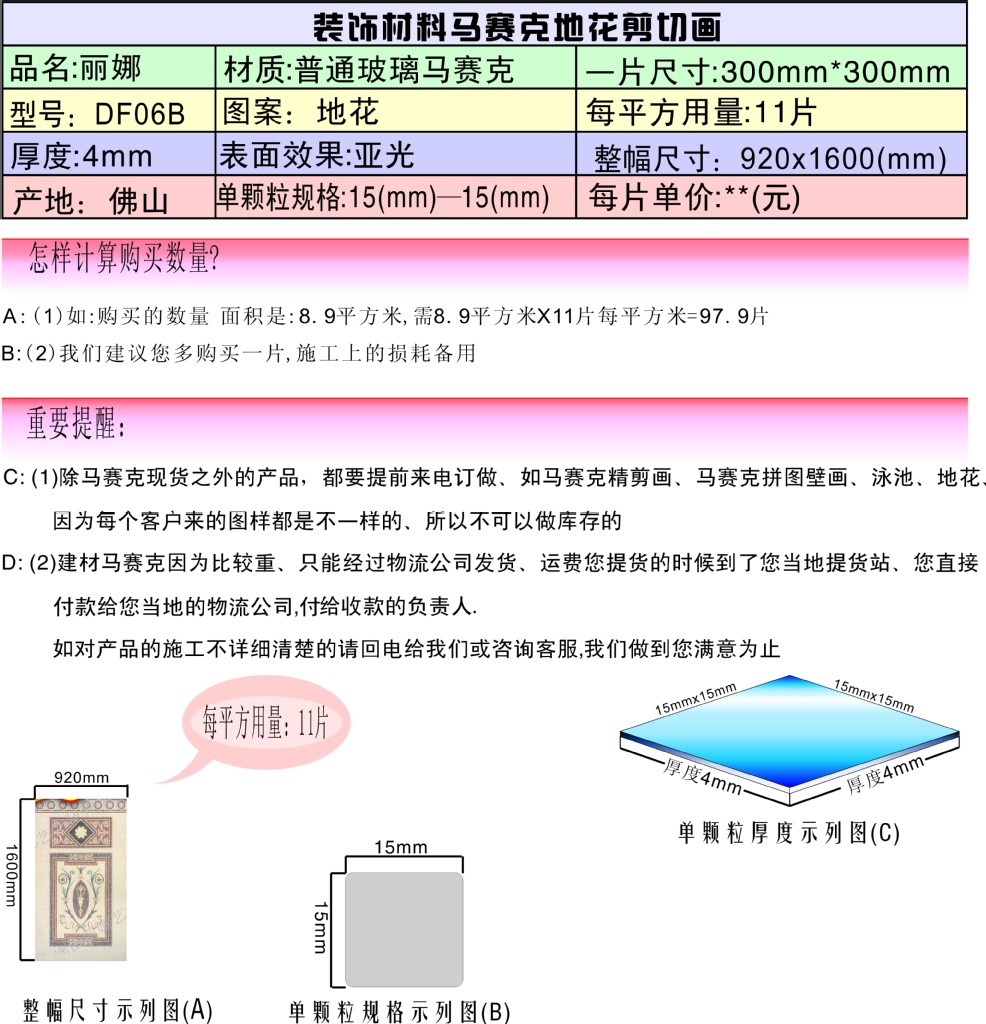 5.运输方式:因为马赛克比较重,根据不同的产品,每平方的重量在10-12公斤左右,所以不适合用快递发货、 玻璃马赛克除样品、 样板之外或特殊情况外、一般是不发快递(玻璃马赛克属于易碎物品),最好是通过物流发货。货到后物流公司会电话通知您,需要到当地货运点自提货物。