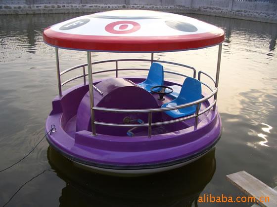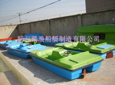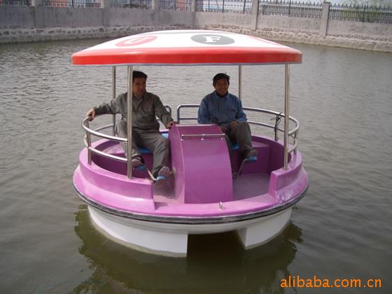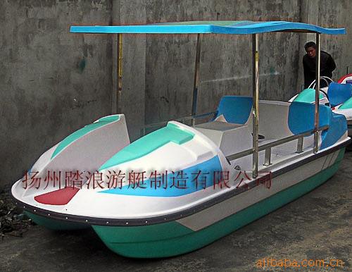 2010年10月本公司新开发的一款适合4人同时游玩的脚踏船,本船采用均通过中国船级社认可单位生产的耐水不饱和聚酯树脂,间苯型胶衣树脂,无碱玻璃纤维无捻粗纱布制造。玻璃钢材料制造,强度高、耐水、耐腐蚀,船体外表树脂胶衣涂层,光洁如镜。船体四周配装高弹橡胶防撞护舷。船头凹甲板设计,游客上下船非常方便。玻璃钢顶棚,脚踏观光,视野开阔,牢固实用,时尚休闲。