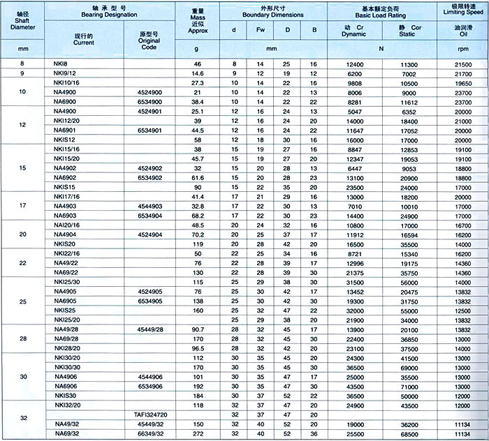 滚针轮廓面在近端面处稍微收缩。滚针和滚道线接触修正的结果可避免产生有破坏性的边缘应力。除了型录所列,可用于一般工程的轴承。如1、滚针保持架组件2、无挡边滚针轴承3、自调心滚针轴承4、组合滚针/球轴承5、组合滚针/推力球轴承6、组合滚针/圆柱滚子推力轴承。