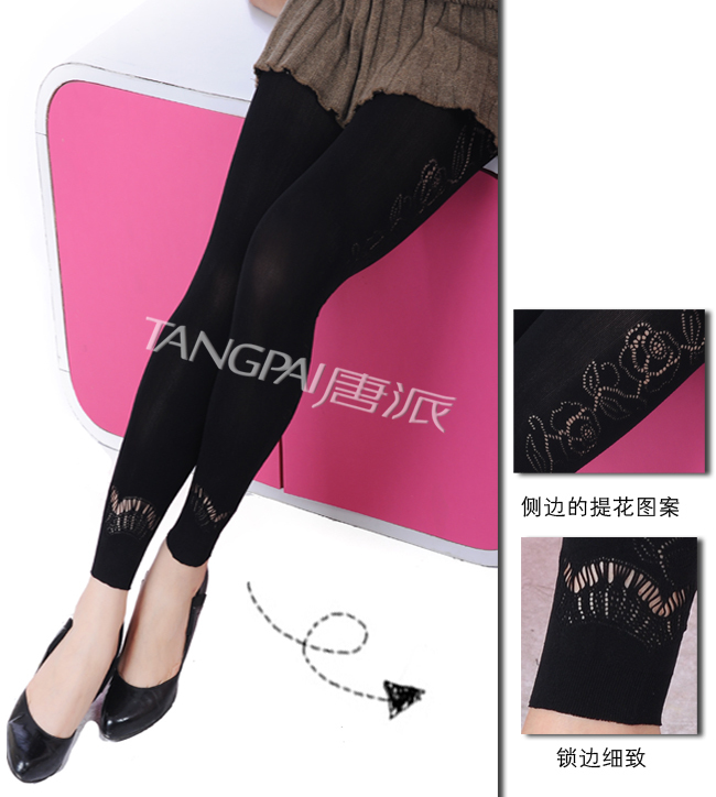 产品特点:采用经编机织造,腿两侧镂空提花、脚踝处网眼设计,秋冬保暖款,将网袜镂空设计和打底裤的独特魅力完美结合,堪称绝配。