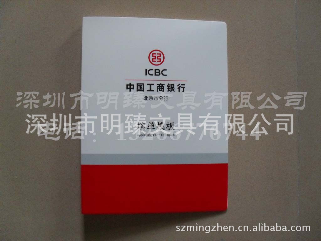 编号:PP塑料文件夹(中国农业银行)尺寸:240*320*30(MM)材料厚度:1.2MM材质:PP文件夹采用优质环保耐用PP原材料生产,在文件夹封面正面及侧面烫银,背条压透明标签插袋,钉长押夹, 功能:用于企业宣传,及企业文件的存档和管理