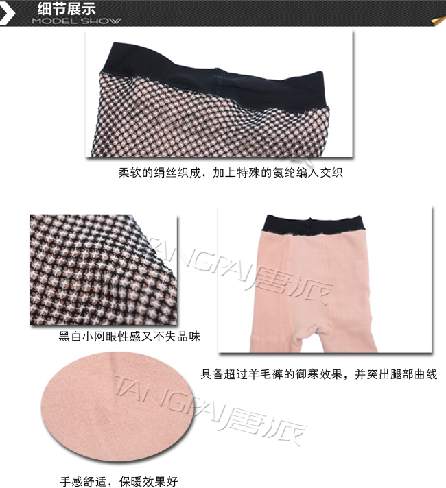 本品采用进口包芯纱材料网格编织,质地细腻;不易勾丝,耐磨性强,纹路清析,层次感强。内层采用超细卡拉绒毛,手感舒适,保暖效果好。耐寒,双层蓄热;弹力大,不起球,不缩水,不掉毛,经过多次水洗,依然保持原有的光泽及柔顺手感,使您在感受保暖升温的同时轻松打造完美曲线!