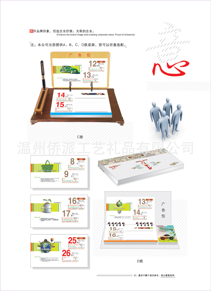 温州侨派工艺礼品有限公司是一家集生产加工台历、挂历、礼品包装盒、吊牌、中国结、大班台垫专版台挂历制作企业。本厂有全自动糊架机对外加工台历架,笔记本册,书壳等。温州侨派工艺礼品有限公司是一家经国家相关部门批准注册的企业。本厂以雄厚的实力、合理的价格、优良的服务与多家企业建立了长期的合作关系。温州侨派工艺礼品有限公司——热诚欢迎各界前来参观、考察、洽谈业务。