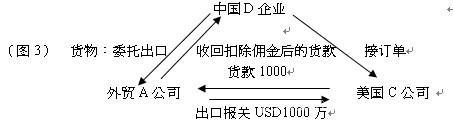 图3)一家没有自营进出口权的中国D企业委托外贸A公司代理出口的话,由于资金流和物流都要通过外贸A公司,所以就会产生三个问题:一是由于资金流要经过外贸A公司再到中国D企业帐户,因此资金方面中国D企业会很被动、不能自由的掌控。二是外贸A公司对于中国D企业这一笔生意到底赚了多少钱是很清楚的,所以隐私得不到充分的保障。三是由于物流要经过外贸A公司,因此中国D企