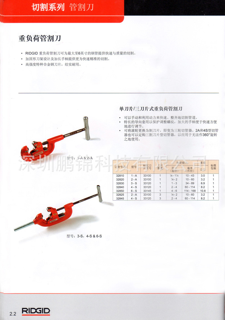 订货号码 | 型号 | 标配刀片货号 | 刀片数量 | 割管能力 | 重量 | 标准包装 |