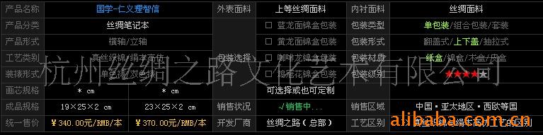 御书房系列之一:【国学】-仁义礼智信高档商务丝绸笔记本 中国是文明古国,是礼仪之邦,在世界上享有盛誉。自古以来仁义道德始终是中华民族生存发展的重要精神支柱和道德根基。中华传统美德主要包括仁、义、礼、智、信五个要素。 “仁”是指同情、关心和爱护这样的心态,即“仁爱”之心。 “义”是指正当、正直和道义这样的气 节,即“正义之气”。 “礼”是指礼仪、礼貌和礼节这样的规矩,即“礼仪之规”。 “智”是指辨是非、明善恶和知己识人的能力,即“智谋之力”。 “信”是指诚实守信、坚定可靠、相互信赖这样的品行,即“诚信之品”。 “仁义礼智信”五大道德要素相互关联、相互依存、相互支撑,构起了我们道德大厦的根基和支柱,与中华传统美德的其他规范相比,具有主导性和根源性。这个道德体系有效地协调了人际关系,改善了社会风气,造就了优良品德,培育了民族精神,推动了社会进步。 谁都知道,“仁义礼智信”为五常,是中国大儒的为人标准。但因其适应范围较广,上至将相,下至庶民,数千年携而不舍,成为名副其实的道德标准。中国的文化之精髓,就是善于变通。虽然框架依旧,但内容与时俱进,其融合性正如水乳相溶。 中国最神奇的文化之源就是“易经”。易者,变也,日月之行,阴阳运转。有人说中国的古代的“阴阳之说”是朴素的辩证法。这是西方逻辑角度的看法,他们认为:只要时间变动,逻辑只能顺承发展,西方逻辑是人类由古代发展而来,或者因为中国是弱国所以就没有先进的逻辑。 但是中国的逻辑就是开药方,对症下药,治病救人,并不是为了赎罪。比方说修炼成仙吧,人可以,白骨精也可以;大鹏雕可以,老树精也可以;白蛇可以,石猴也可以。只要从善如流者,都可以。这就是中国的生命观,也是中国的发展观。