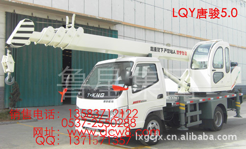 LXQLY-5.0功能:微型液压吊车,选配单缸或多缸发动机作动力,用于行走及吊装,可安装电机或泵站连接380V电源直接工作已节省燃油,五边形吊臂杆高20米,最大起重量5吨,装有中心回转体,可360度自由旋转,可选装流线型驾驶室,快速落绳装置,以提高工作效率2倍以上,国内行业最低价位。车型尺寸:长*宽*高:7760mm*2150mm*2570mm