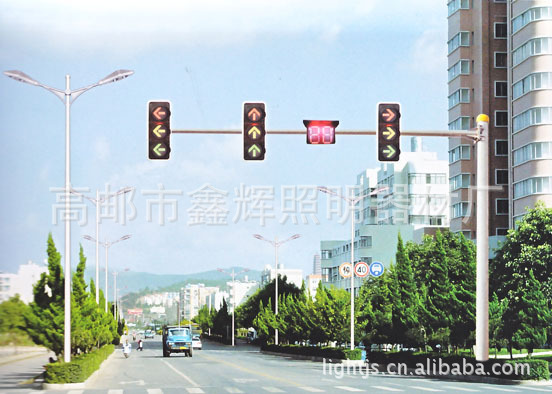 机动信号灯由红、绿两色灯组成。在红灯镜面上有一个红色的满屏形象,在绿灯面上有一个绿色的满屏形象。机动信号灯设在车辆通道前方,用于指示车辆按指示行驶方向通行。灯头面向车行道,与道路中心平行。