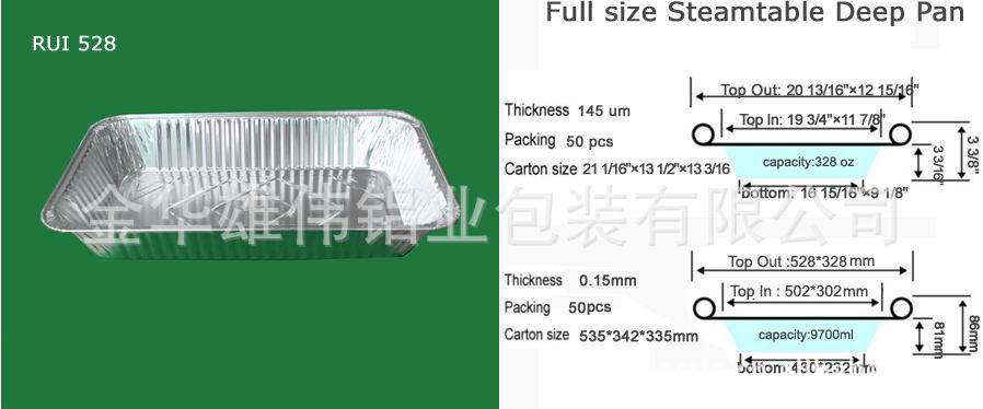金华雄伟铝业包装有限公司是一家专门从事铝箔制品研究、开发、生产和销售为一体的综合型出口企业。公司坐落于世界小商品名城-中国义乌,地理位置优越,交通便利。我们采用国际通用环保优质新型的材料,生产制造各类铝箔容器,铝箔餐盒,铝箔航空餐具,铝箔食品包装盒,铝箔食品保鲜膜以及其他铝箔制品,并可根据客户的要求来样加工定做。产品主要使用于家庭厨房、民航企业以及和包装食品相关的服务行业。如航空配餐,西式糕点烘焙,烧烤,速食店,家庭聚会,快餐盒等等。我们的产品以其外表美观、使用方便、安全卫生、无异味、不渗漏、保鲜、保香、环保可回收等优良特性远销欧美、日本和中东各地,享有极好的声誉。
