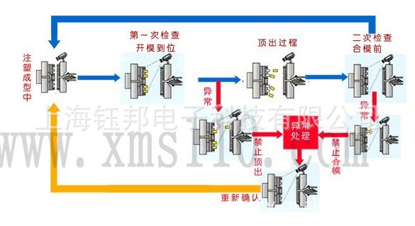 模具保护器(又称模具电子眼),能在一个完整的成型周期内对所关心的模具型腔面进行两次拍照,即一检和二检,通常一检所选择的时机为型开刚刚完成,顶出动作还没有进行的时刻,这时的型腔多附有刚成型出的产品,即有品腔,这时间拍照通常会检出所成型的产品是否不良,是否有留定模的产品;通常二检所选择的时机为顶出回退到位(不使用机械手时)或机械手已到安全区域且顶出回退到位,制品是否有粘附于动模,在合模动作还没有动作之前。这时的模具型腔不含有成型品,即无品腔,这时拍照会检出是否有未脱落的制品,还能帮助判断镶件、顶杆和滑块的位置或状态是否正常。当一检失败时,会有报警提示,又可以加入不顶出的连锁保护,当二检失败时,也有报警提示,并指示注塑机不准合模,这样就有效地保护了模具。