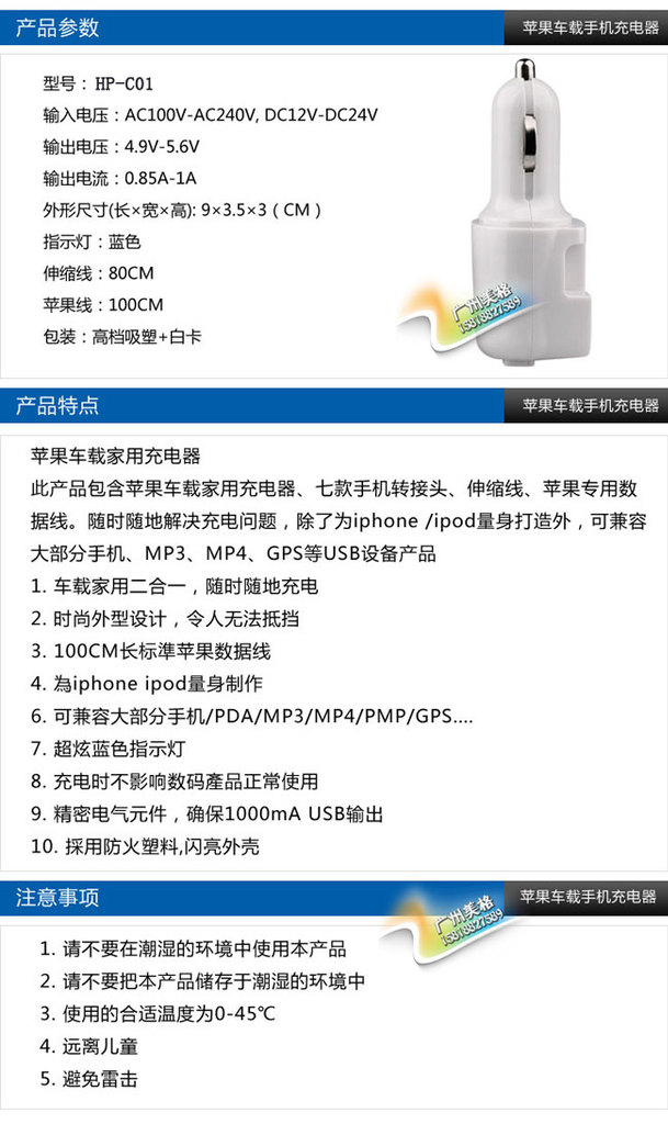 此产品包含苹果车载家用充电器、七款手机转接头、伸缩线、苹果专用数据线。随时随地解决充电问题,除了为iphone /ipod量身打造外,可兼容大部分手机、MP3、MP4、GPS等USB设备产品