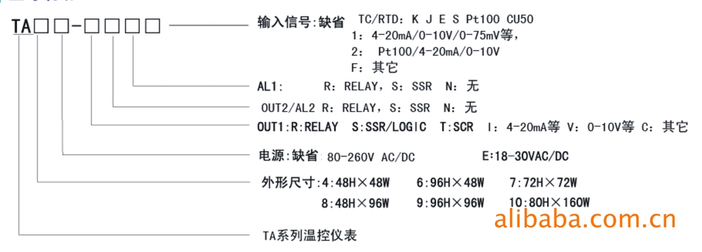 例:TA4-INR1表示为48*48*80mm尺寸,供电90-260V AC/DC,电流4-20mA输出,带一个报警,输入为4-20mA |