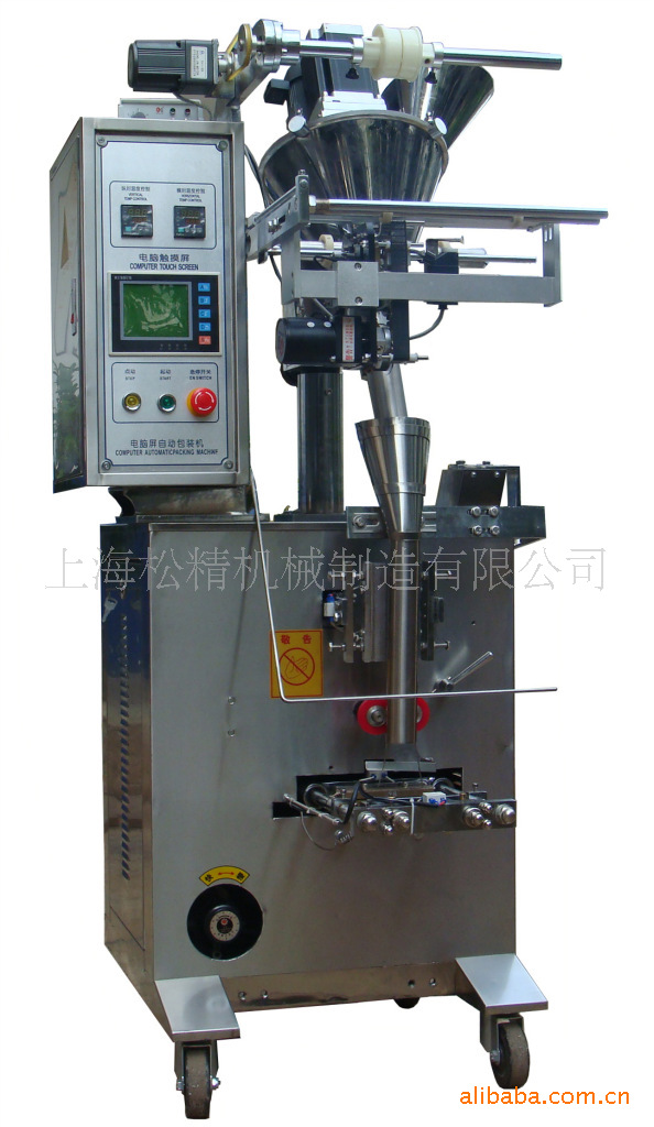 采用微电脑控制,螺杆计量。可自动完成制袋、计量、充填、封合、分切、计数等功能。无级调整袋长、振荡下料、日期打印、易撕口。包装成品的形状为三边封或四边封。三边封为常规产品,四边封需特殊定制热封器。