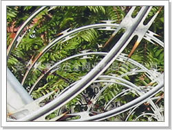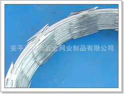 编织及特点:用镀锌钢板或不锈钢薄板钢板冲压成型包附于钢丝(筋丝)之上,形成锐利的尖角做刀片。该产品具有美观、经济实用、防阻效果好、施工便利等特点,锋利的刀型刺由双线扣装后成蛇腹状,既美观又让人不寒而粟。起到了很好的恫吓作用。