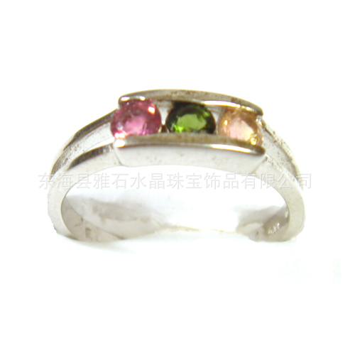 名称: 925银镀白金天然粉绿黄碧玺戒指
