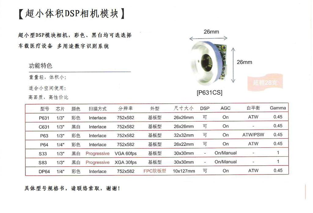 彩色和 黑白均可选择,图像传感器有1/4英寸和1/3英寸可选择.