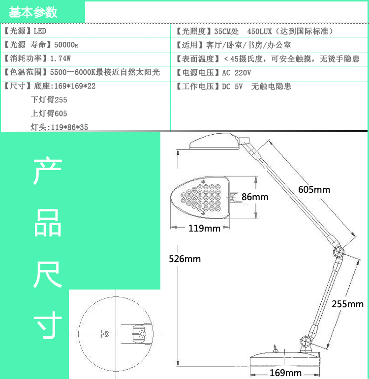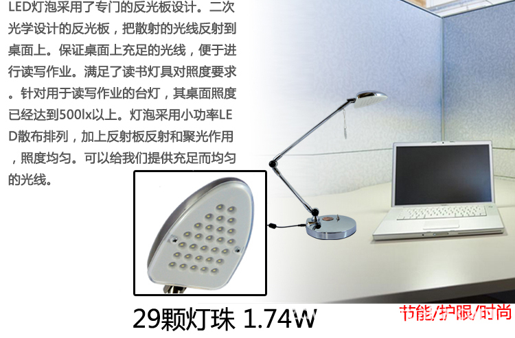 (1)强力省电——本LED台灯(也称节能灯)采用29个超高亮度LED灯,每个LED灯仅0.06W,强力省电,无热产生;无需用电话线连接来节能,也不用花钱买电池,插上电源即可使用;强力省电,发光均匀无光斑,不刺眼,防炫目