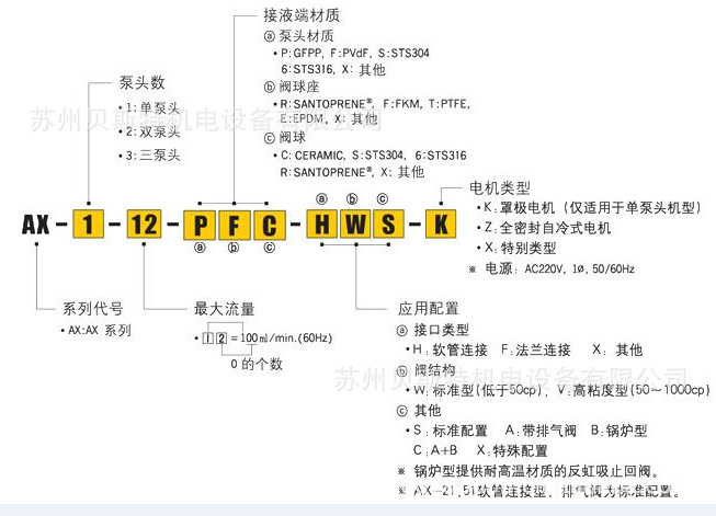 AX系列是由全密封自冷式电机驱动的小型计量泵,电机无需风扇制冷。流量范围1.2L/H—62.4L/H(20ml/min—1040ml/min).机身及机座由锌铝合金经精密铸造成型,坚固耐久。泵头材质有GFPP、PVDF及不锈钢等。应用范围涵盖中小型工业水处理系统。