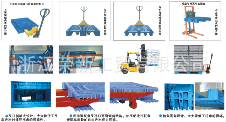 塑料托盘选用100%具有高冲击强度的高密度聚乙烯(HDPE)或共聚丙烯(PP)为原料注塑加工而成。并且应用了反冲击技术而设计,强度高、耐冲击性好、承受力大、使用寿命长(添加了抗老化剂)。具有质轻、平整、美观、整体性好、无钉无刺、无毒无味、耐酸碱、无火花、防爆、防滑(具有防滑垫)、回收价值高等特点。使用寿命是普通木制托盘的几十倍。