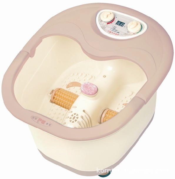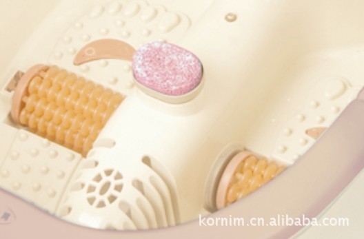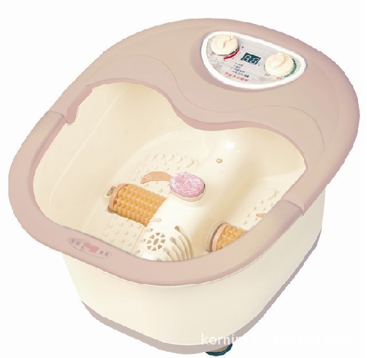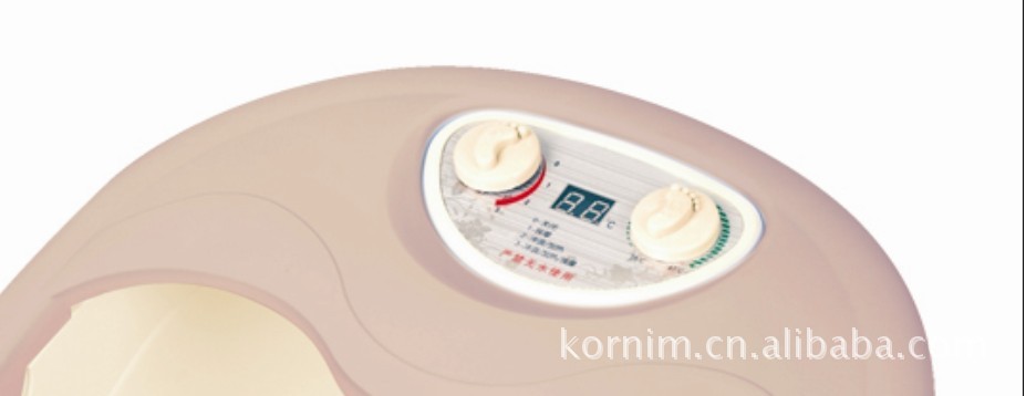 产品为米色,上端配有数码显示屏,以及功能旋钮,桶内配有砂石按摩头,红外灯,桶内底部还有电动按摩脚轮,气浪臭氧孔。产品底座为艺术减震垫脚.本公司经营足浴器,质量保证,欢迎咨询洽谈。