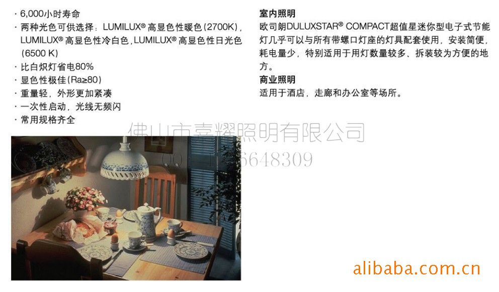 OSRAM(欧司朗)在中国共设有三个生产基地,并拥有研发中心,公司在华员工总数接近8000人。其中OSRAM(欧司朗)(中国)照明有限公司成立于1995年,公司拥有员工约3500人,在全国设有近40个销售办事处。OSRAM(欧司朗)中国已成为OSRAM(欧司朗)亚太地区的实力中心,并在OSRAM(欧司朗)全球战略中扮演重要角色。 OSRAM(欧司朗)的光源产品及照明系统多达5000多个品种,能够充分满足人们在工作、生活及特殊领域的多方面需求。其产品系列包括:荧光灯、紧凑型荧光灯、高强度气体放电灯、卤素灯、汽车灯、摩托车灯、特种光源、电子镇流器和发光二极管等。先进的电子管理系统及完善的物流配送网络实现了OSRAM(欧司朗)产品服务中国千家万户的愿望。