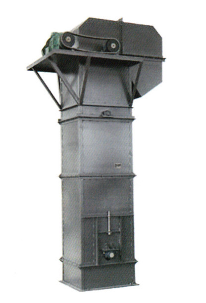 物料经设备进料口均匀地导入安装固定在作连续封闭运行的提升链上的料斗,将物料从机尾进料口处提升至机头出料口处排出,实现单点进料、单点重力式或混合式卸料。