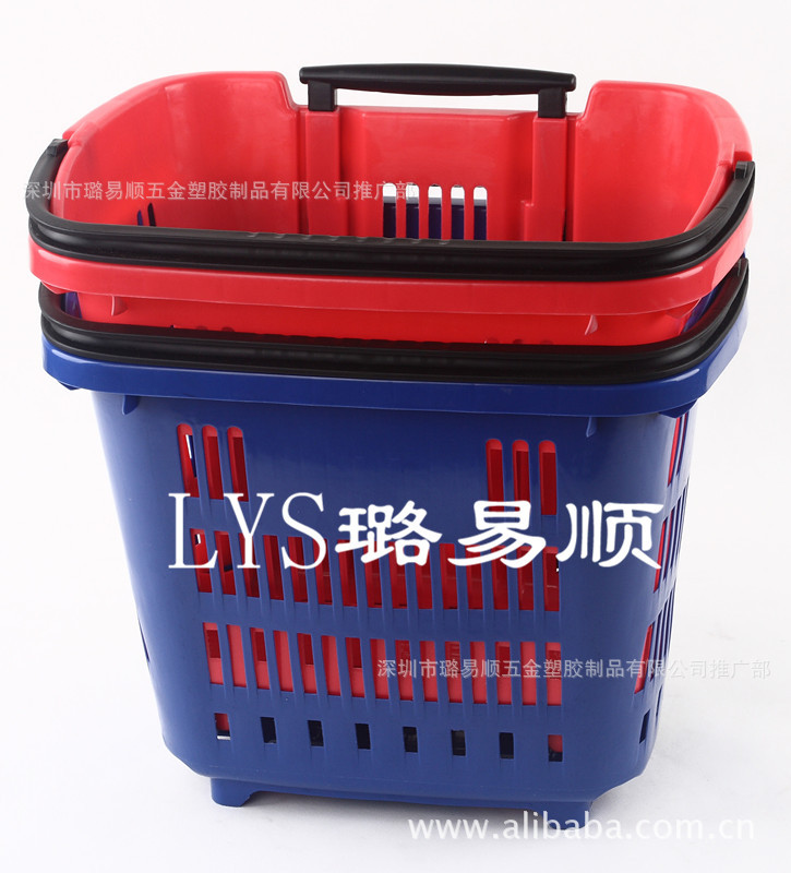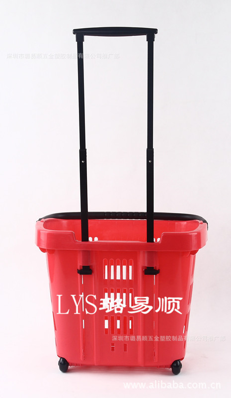 厂家直销超市购物篮,拉杆购物篮,带拉杆可折叠式,带两轮子。使用方便,价格实惠。购物篮长460*宽350*高405MM,容量为34L。拉杆为铁质拉杆,坚固耐用,篮子为塑胶材质(材料为PP新料生产),可应客户要求做多种颜色。常用红色,蓝色购物篮我司备有现货。(做其它颜色最低订量1000套以上),购物篮单重1.53KG,纸箱包装,一箱装12套.纸箱包装规格:47*36*112CM,G.W:20.1KGS,N.W:18.36KGS.20尺柜可装1800套,40尺柜可装4000套。