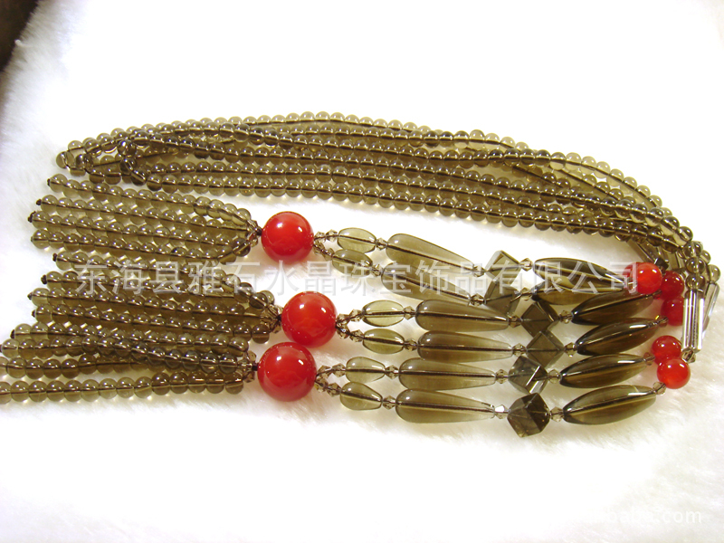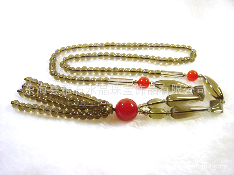 名称:时尚韩版茶水晶+红玛瑙毛衣链 长度:80CM 功能:茶水晶又叫烟晶,性能温和,汇聚日光精华,是从不需消磁的水晶,也是强有力的清洁剂与再生石。由于它可以转化与驱除负性能量,因此也是环境的保护石。水晶疗法认为,作为人体气场的保护者,茶水晶能事先发出警告以便人们采取自卫措施。它在灵性上的其他功能还包括:净化所有的轮穴,特别是太阳轮与脐轮;激活顶轮,激发人们的灵感;净化与协调灵体,使身心合一,给生命带来能量。将茶水晶球作用于冥想,能唤醒人们更高层次的灵性。 茶水晶还享有财富石的美誉,据说能够吸引财富、成功以及所有美好 的东西,并保护财产。同时,它也是幸福、慷慨之石,鼓励人们分享 自己的所有,为佩戴者带来快乐,使人们远离忧郁症,有助于协调团 体或家庭的不和,对身心均极有助益,在心理上,茶水晶能提升人们 的自信与自尊,消除具有破坏性的意念;提升个性,增强动力,激人 们的创造力,加强自我表达的能力;防止人们对批评反应过激,鼓励 有建设性的评论;鼓励人们以乐观的态度摆脱过去,展望未来;帮助 人们感受新体验带来的快乐,鼓励人们探索一切可能的途径,直到发 现最好的解决方法。茶水晶能使人集中注意力,振奋精神;有效地消 除抑郁、恐惧与担忧;促进内心的平静以开发智慧;帮助人们吸收信 息,分析形势,并将人们导向积极正确的方向。用茶晶作为饰物佩 戴,能克服在表达思想民感情方面的障碍。 在怀感上,茶水晶不仅能平息怒气,消除负面的品质,促进怀感的 和谐,提升生活的乐趣,将最深层的感受释放出来,还有助于人们克 服对承担责任的恐惧。