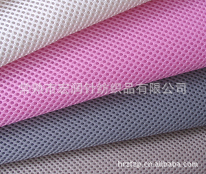 主要用于车套、运动服装、箱包等,牢固耐用。表面是网状的(较大的圆形网孔),底下有层密网,使得表面的网不至于变形太大,加强了面料的牢度及色彩度。