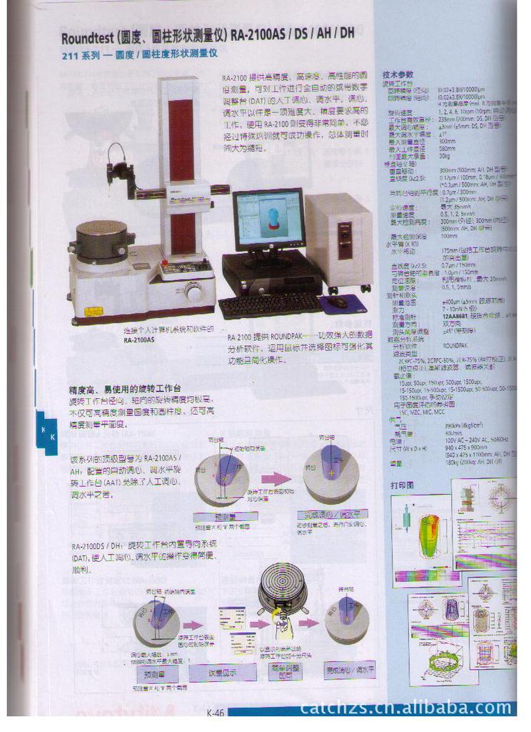 RA-2100提供高精度、高速度、高性能的圆度测量。可对工件进行全自动的或带数字调整台(DAT)的人工调心、调水平。调心、调水平以往是一项难度大、精度要求高的工作,使用RA-2100则变得非常简单,不必经过特殊培训就可成功操作,总体测量时间大为缩短。RA-2100配上功能强大的数据分析软件ROUNDPAK就配置齐全了,该软件只需鼠标控制图标即可轻松操作,使测量的功能更强大,操作更简便。