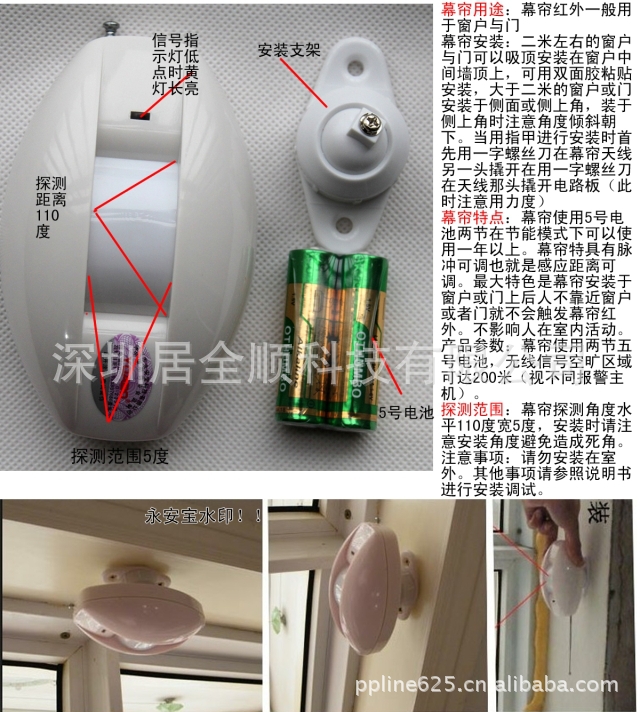 本产品为无线幕帘型被动红外。它使用了先进的信号分析处理技术,提供了超高的探测性能和防误报性能,从设计上保证了产品的稳定性。当有入侵者通过探测区域时,将自动探测区域内人体的活动。如有动态移动现象,它则向控制主机发送报警信号,产生报警。