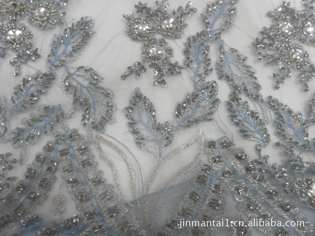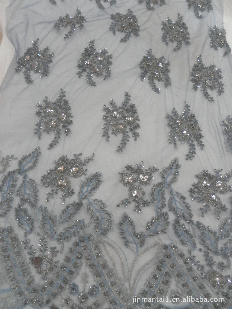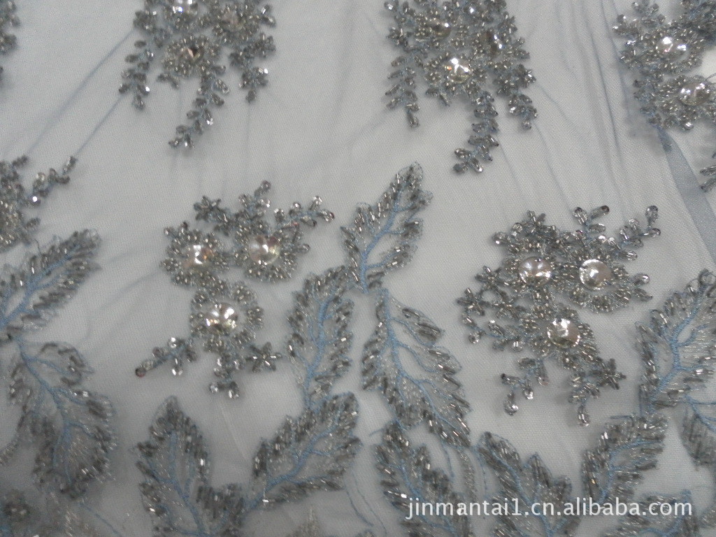 1.品名:全涤网布手工盘带加手工串珠绣花面料