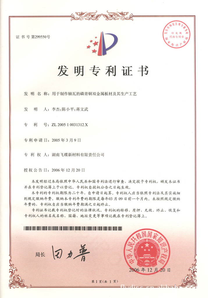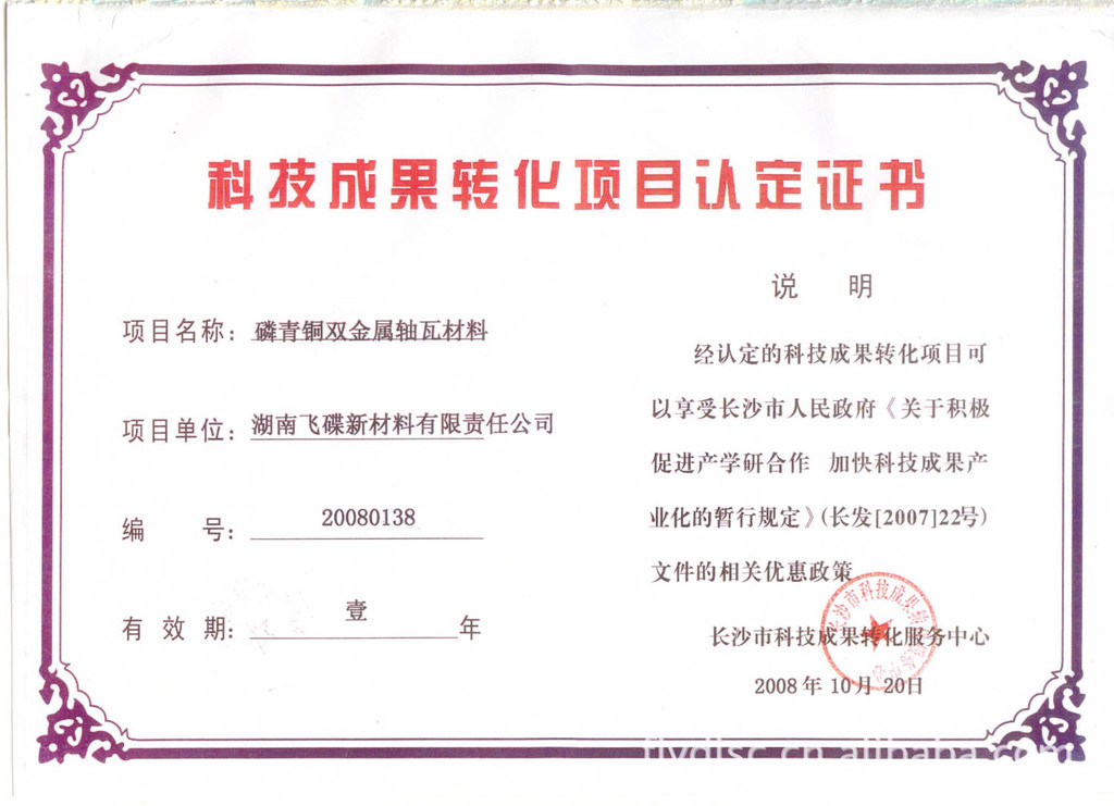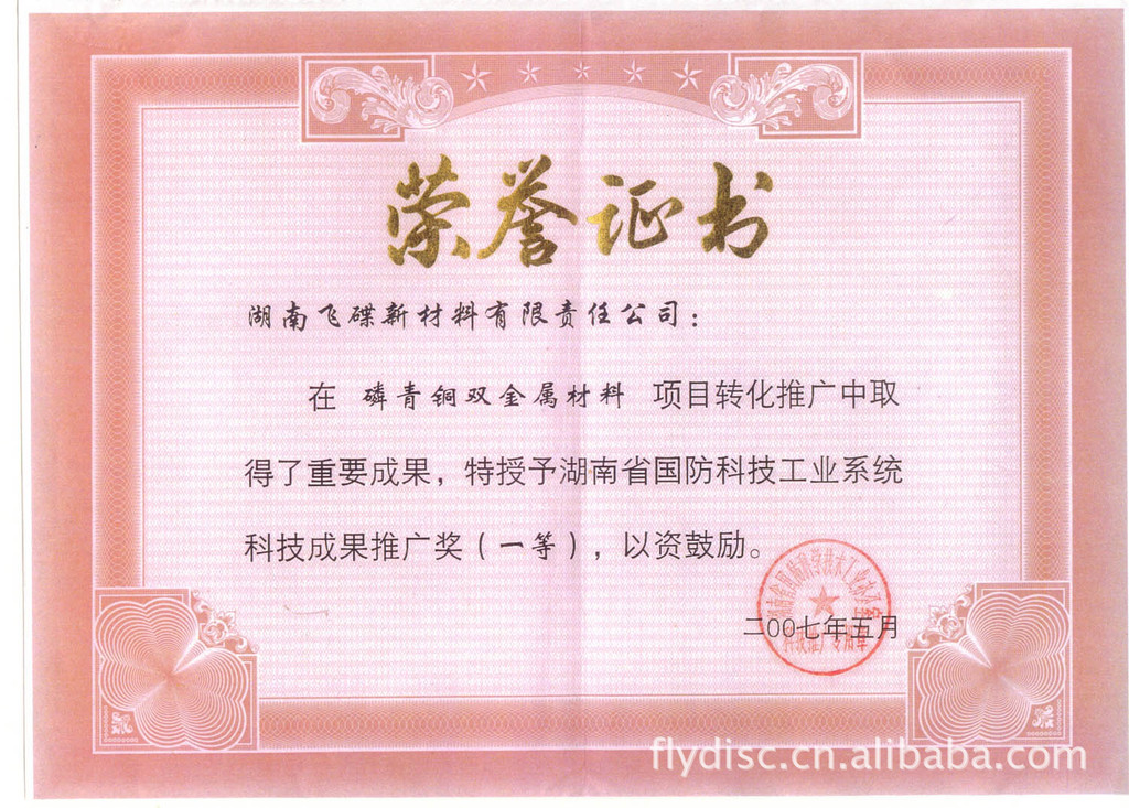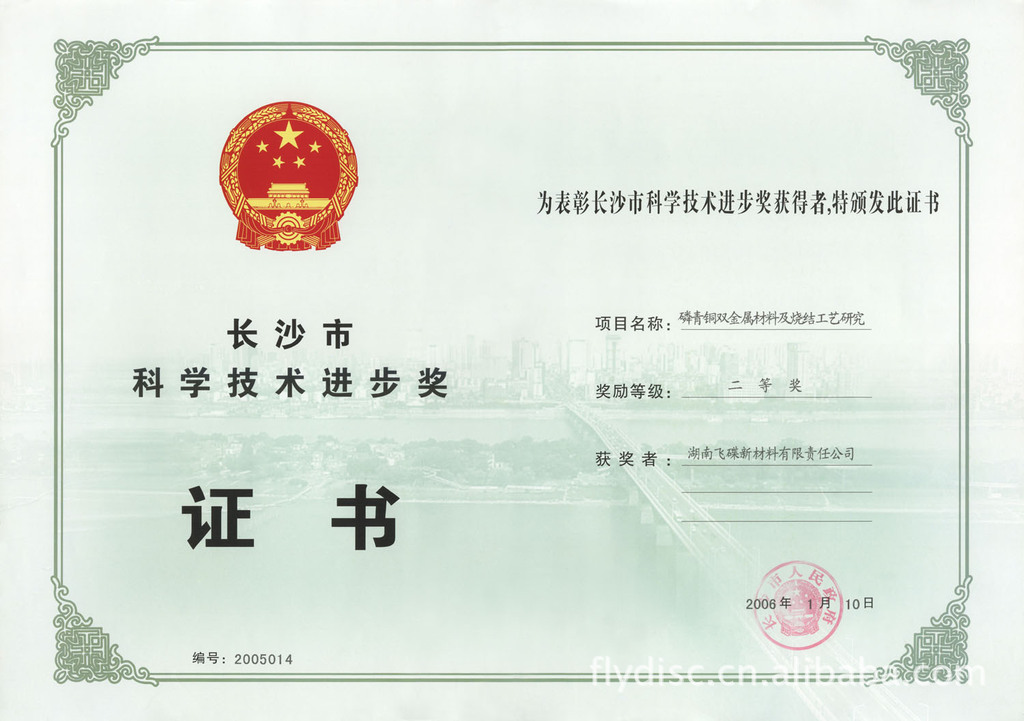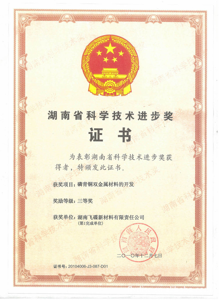 2004年公司自主研发成功的磷青铜双金属材料,由于合金主要成分中不含重金属铅,产品符合欧盟办法的有关环保指令的要求,是目前国内制造“环保型”内燃机新的轴承材料。2005年6月该项目技术开发成果通过了湖南省科学技术厅组织的鉴定,专家鉴定认为:采用两步烧结的全新技术工艺属国内首创,工艺路线先进合理,稳定性好,能耗低,磷含量易于控制,技术达到了国际先进水平。产品填补国内空白,各项技术指标达到了用户的要求。使用结果表明该产品应用情况良好,具有广阔的推广应用前景。同年,该项目获得长沙市科技进步二等奖,2006年列入国家重点新产品计划,2006年获得发明专利,2007年获得湖南省国防科技工业系统优秀科技推广成果一等奖,2009年荣获湖南省核工业地质局科技成果一等奖,2010年荣获湖南省科技进步三等奖。
