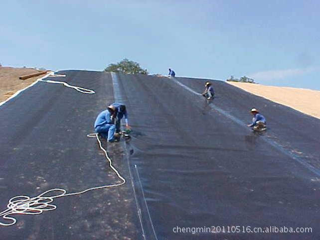 复合土工膜(复合防渗膜)分为一布一膜和两布一膜,宽幅4-6m,重量为200—1500g/平方米,抗拉、抗撕裂、顶破等物理力学性能指标高,产品具有强度高,延伸性能较好,变形模量大,耐酸碱、抗腐蚀,耐老化,防渗性能好等特点。能满足水利、市政、建筑、交通,地铁、隧道、工程建设中的防渗,隔离,补强,防裂加固等土木工程需要。由于其选用高分子材料且生产工艺中添加了防老化剂,故可在非常规温度环境中使用。常用于堤坝、排水沟渠的防渗处理,以及废料场的防污处理。
