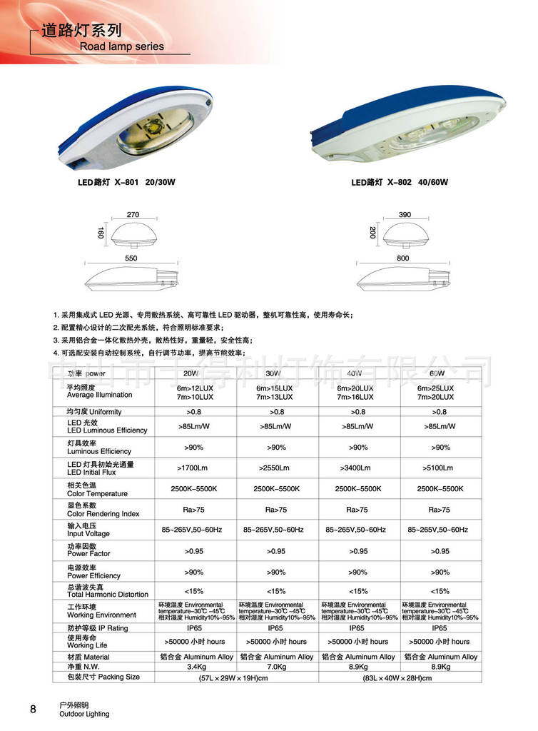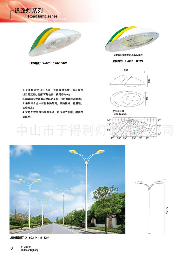 大功率LED路灯是我厂采用单颗超大功率LED和独有的制造工艺制作而成,实现了单颗大功率半导体LED的照明,引领了半导体LED用于路灯照明的新时代。适用范围:城市道路、居住区、工业区、人行道、广场、公园、学校、别墅、庭院等场所的道路照明。产品特点:发光效率高、视觉逼真。选用进口芯片并自主封装的单颗超大功率LED作为光源,色温4500~6500K,显色指数80以上。寿命长、功耗低。LED可连续使用50000小时,使用寿命长达10年以上,终身不需更换光源。在同等视觉条件下,比高压钠灯节电60%,比白炽灯节电80%。降低工程建设费用。工程在配套的预埋输电、变压器、配电柜、铺设电缆等投资上可节约70%以上,总工程价位相当于高档路灯(钠灯)的价位。环保节能无污染,稳定性高。LED对环境无污染,使用稳定性高,实现了真正意义上的绿色环保节能照明