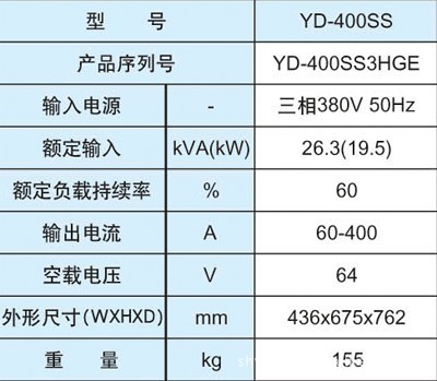 [型号]: YD-400SS[产地]: 唐山松下 [包装]: 木箱包装 [应用领域]: 可焊低碳钢、高强度钢、耐热钢、SUS、铸钢、铜合金等多种材料,带气刨功能。