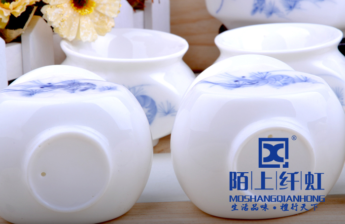 - 烧成温度比普通玉瓷高出500度以上,普通瓷烧成1880 -1300度之间,我们烧成的温度在1330-1350度,所以光泽度特别好。烧成温度越高瓷质越细腻、坚硬,也就是瓷化程度越高,吸水率越低,越不会黏附茶垢,更容易清洗。素有“白如玉、薄如纸、敲如钟、声如謦之美誉。做工方面我们的宗旨是“追求卓越精益求精”,在别人没注意的细节地方下大功夫,尽量精细化,达到平如镜。从模具到产品要求一流的做工,并且经过道道工序的检验。