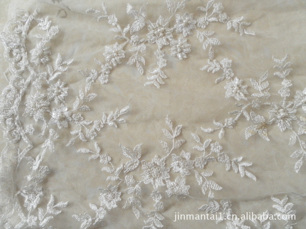 1.品名:全涤网布手工盘带加手工串珠绣花面料